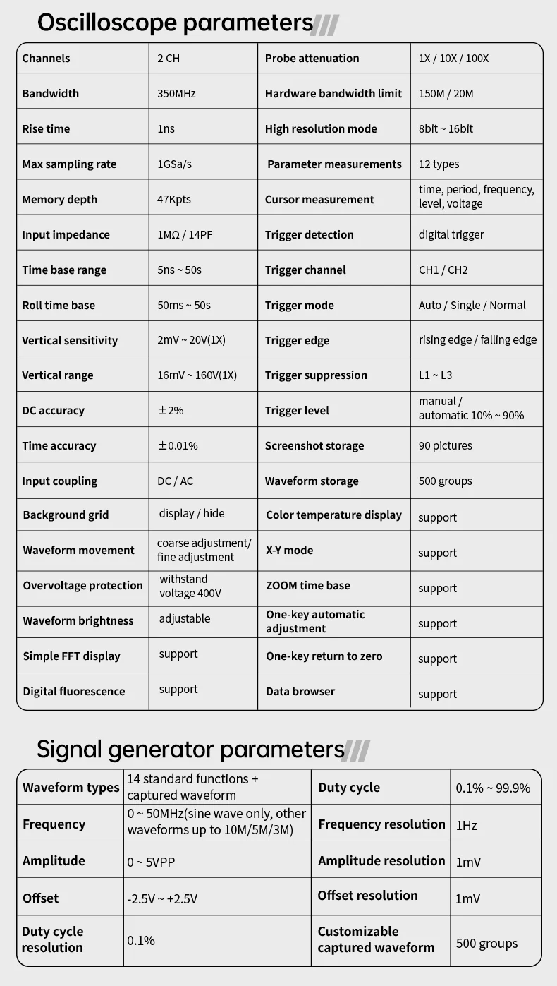 ● Powerful multi-function integration: The DPOS350P combines a 350MHz oscilloscope, 50MHz signal generator, 200K~350MHz spectrum analyzer, and a 50MHz frequency response analyzer to meet various signal testing needs.