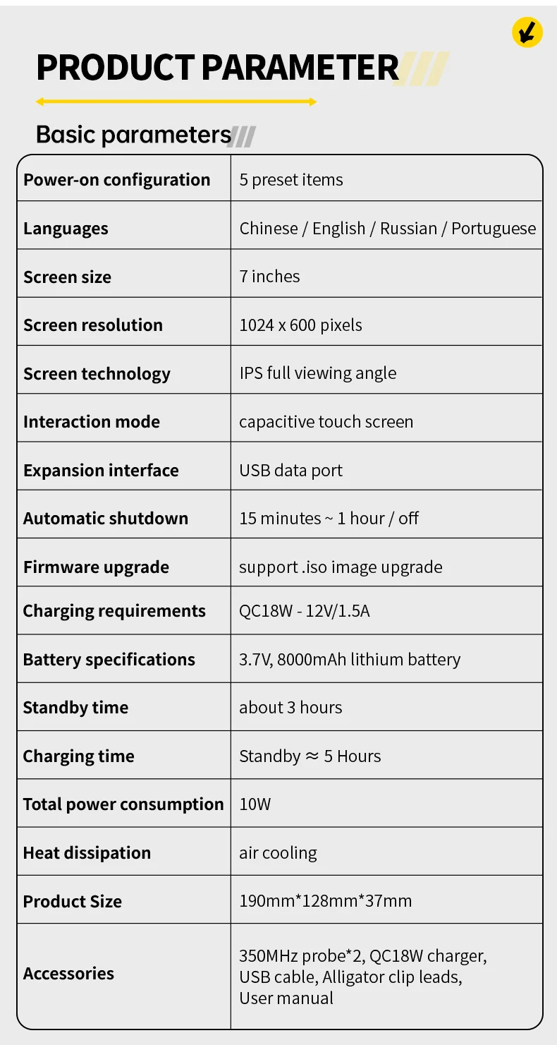 ● Fine display and operation: Equipped with a 7-inch 1024×600 high-resolution IPS touchscreen, it provides clear waveform display and supports grayscale and color temperature mode switching, making it easy to operate in different testing environments.